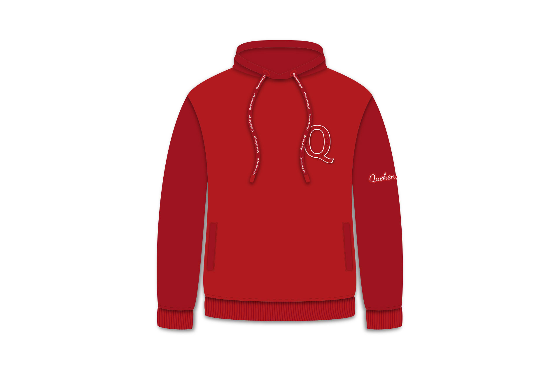 Heritage-Hoodie im Collagejacken-Stil: zwei CI-Rot-Töne, eigene Materialentwicklung, Trio-Set mit Patch & Chenille-Stick. Komfortabel, langlebig, markant – Corporate Fashion statt Katalog.