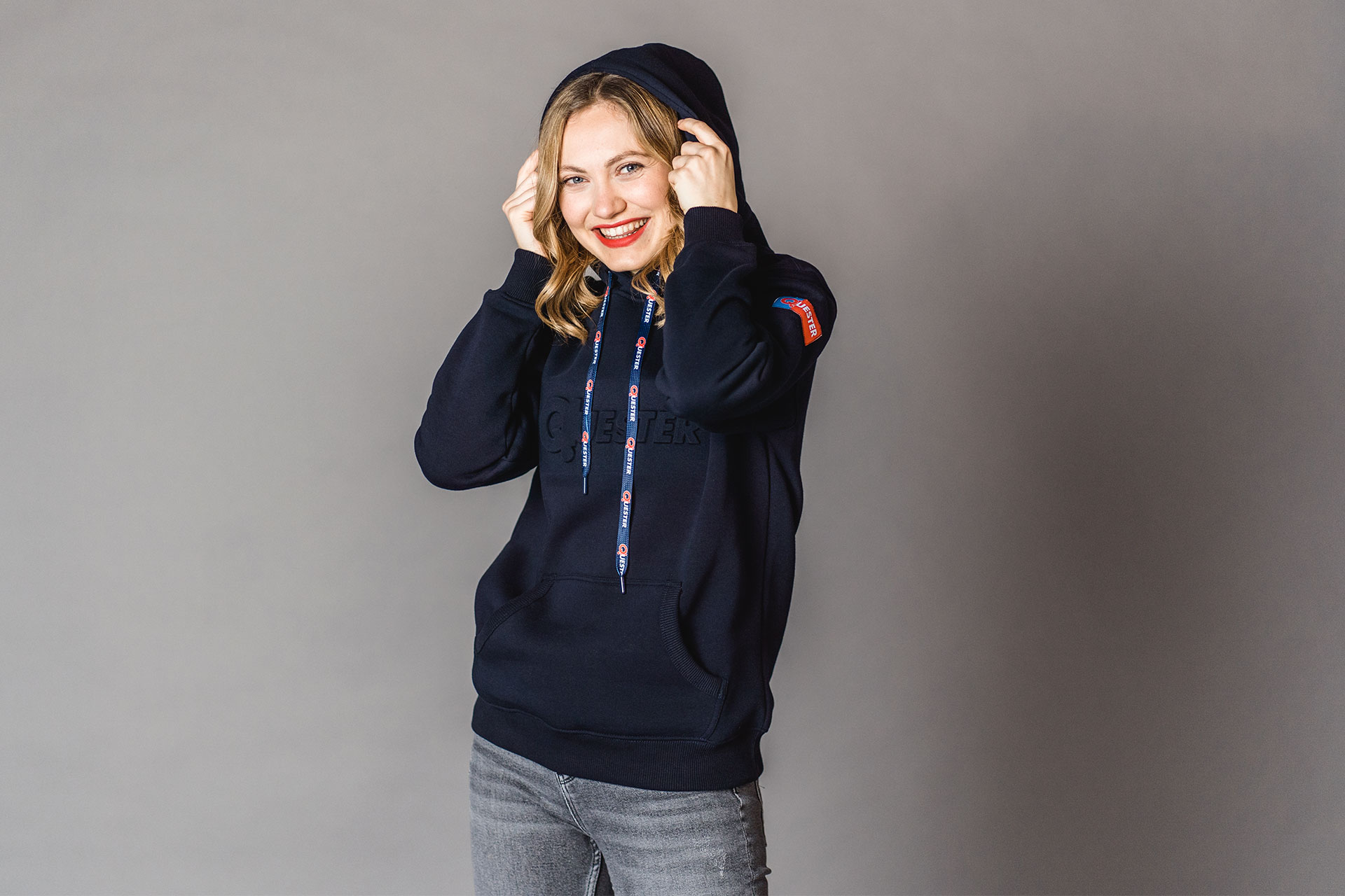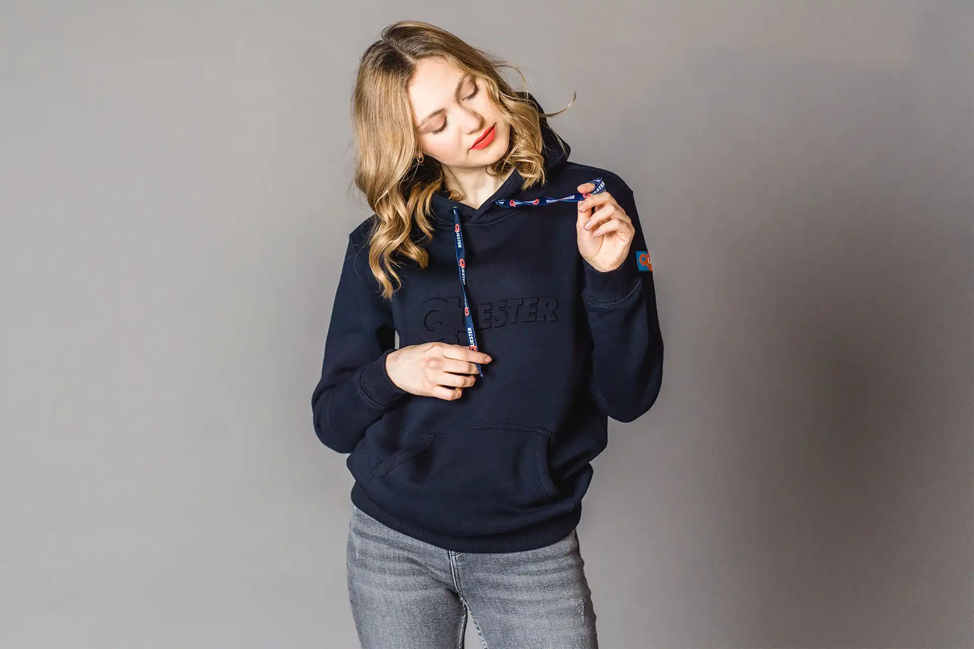 Im Folgejahr haben wir den Quester-Auftritt um ein ikonisches Kleidungsstück erweitert: einen Hoodie für Mitarbeiter:innen. Ausgehend von der Vorgabe der Geschäftsleitung haben wir ein reduziertes, elegant geschlossenes Design entwickelt. Die Marke wird über eine hochwertige Ton-in-Ton-Prägung (embossed) auf Vorder- und Rückteil integriert – ein Detail, das fernab von Katalogware liegt und formal „runway-tauglich“ wirkt.